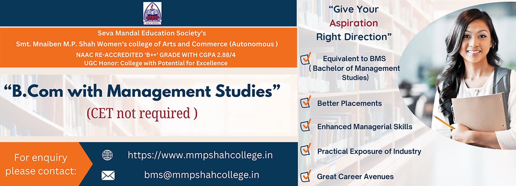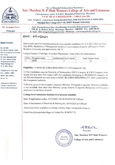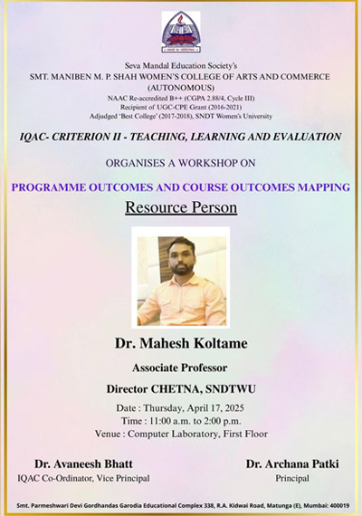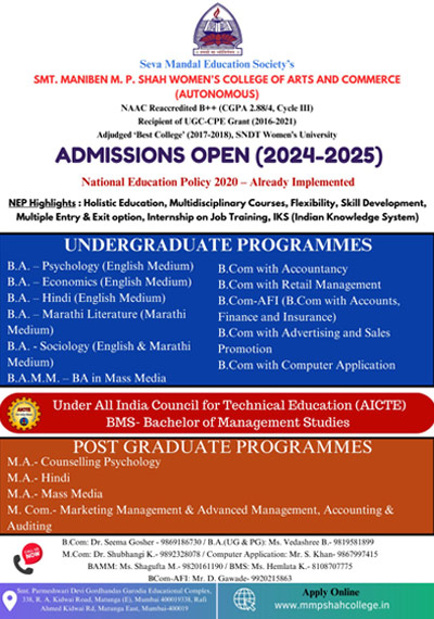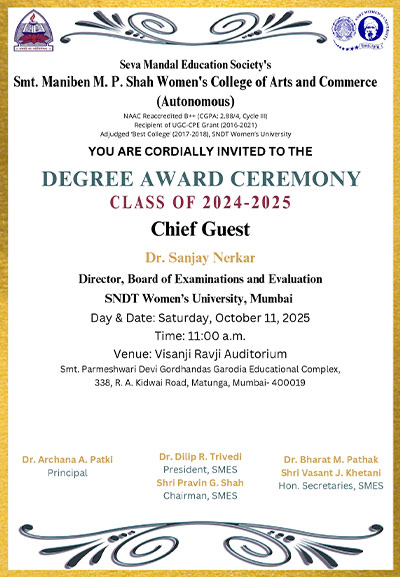 Seva Mandal Education Society (SMES) established in 1957 believes in the principle that Educate a man and you educate an individual; educate a woman and you educate the entire family! SMES has always been a pioneer in the field of women’s education starting colleges and courses as per the demands of society and providing women students a wide choice of courses.
